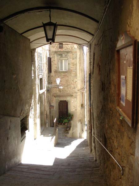 | tratti appena modificati da mura medievali. Salvo pochi bei palazzi rinascimentali, il carattere prevalente degli edifici è medievale e contribuisce a dare alle strette ed erte strade un aspetto molto suggestivo. Da ogni punto di Cortona si gode una stupenda vista che abbraccia tutta la Valdichiana. |